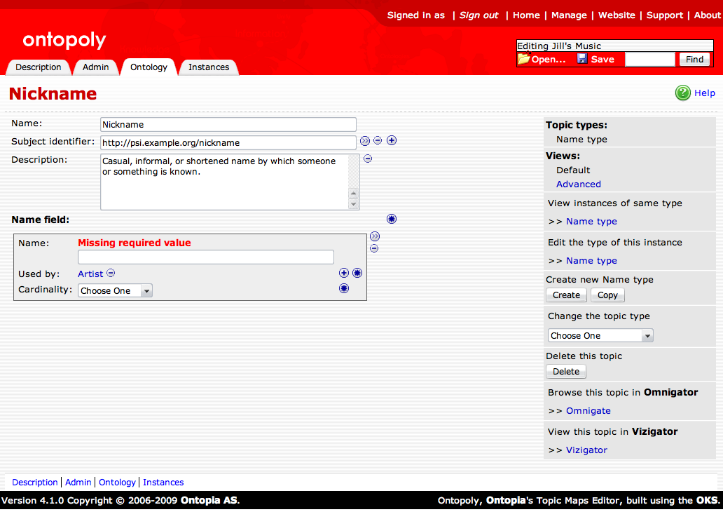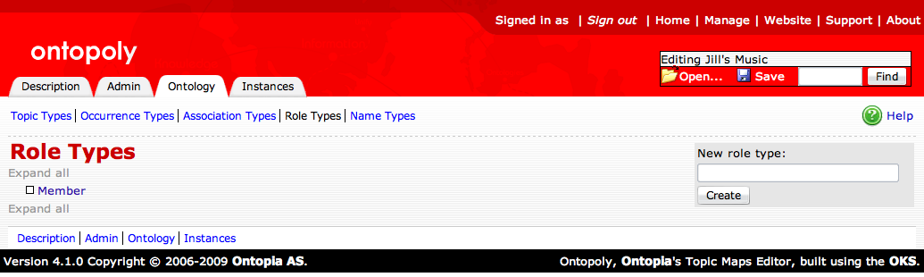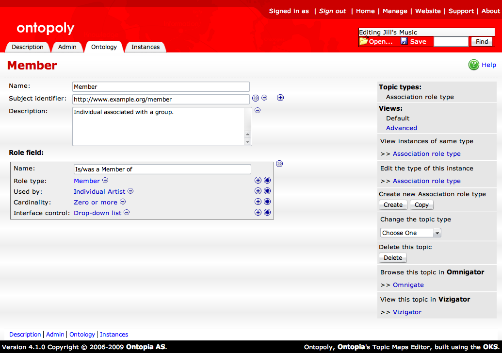 To provide a practical introduction to Ontopoly’s functionality, we’ve created an ontology for a music organization topic map, MyMusic, and an example topic map that uses that ontology, Jill’s Music.