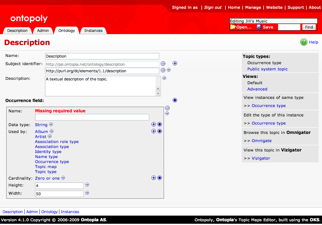 Ontopoly’s Type Configuration Pages are used by the ontology designer to define the topic, name, association, association role, and occurrence types that will be available to creators of the instance topics. To take an example, when an author creates a topic of type composer, the Instance Editing Page will show the fields that apply to a composer, such as name, date of birth, and works; but when editing an opera, the fields will be different.