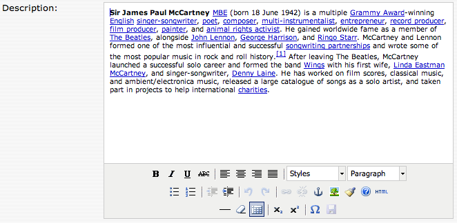 HTML occurrences can be edited using an embedded HTML editor (currently TinyMCE). This editor provides rich formatting capabilities, but allows you to edit the actual HTML document.