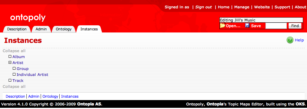 To provide a practical introduction to Ontopoly’s functionality, we’ve created an ontology for a music organization topic map, MyMusic, and an example topic map that uses that ontology, Jill’s Music.
