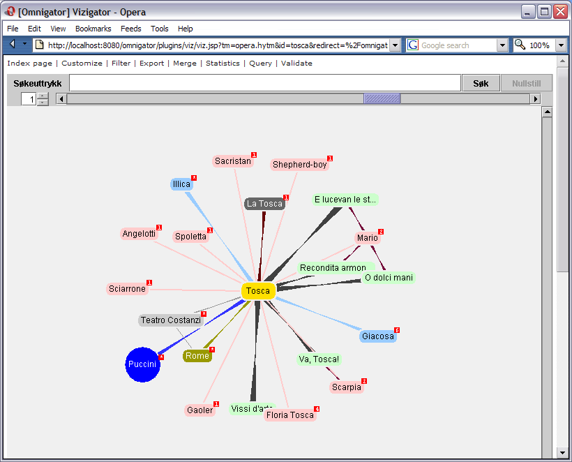 Hit the Back button a couple of times and you should be back at the topic 'Tosca' (the opera, not the character). Click on the Vizigate button, wait a few seconds while the applet loads, and you should get a graphic display like the one shown below: