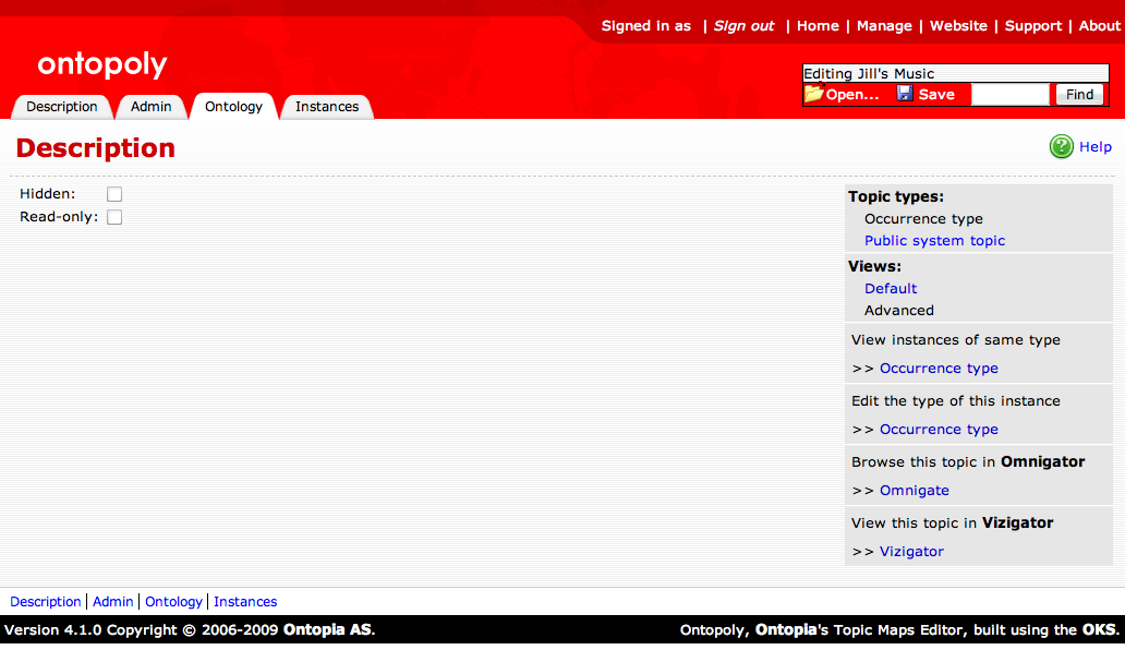 For this reason, you need to create an ontology before you can edit a topic map instance in Ontopoly. Often the tasks of creating the ontology and editing the topic map instance (that is, populating the ontology) will be carried out by different people. Ontopoly is therefore divided into two main parts: the ontology editor and the instance editor. The application also has an administration interface, i.e., a page for adding metadata to the topic map (description, creator, version, etc.), validating it, etc.; and an interface for exporting to various interchange syntaxes.