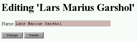 This shows the form for editing the name of a 'person' topic modified to lock the person topic when the page is rendered. This means that until the form is submitted nobody else can edit this topic. The lock attribute must contain the name of a variable, and all the objects in the collection that variable is bound to will be locked. Should one of them fail to be locked none will be locked, and the page will fail to load with an error message.