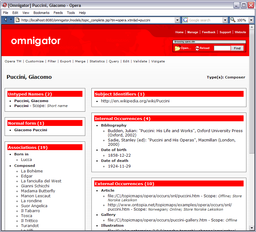 This demonstration uses Steve Pepper’s Italian Opera Topic Map, a fairly small but semantically rich topic map that has been used in many talks and tutorials in the last few years.