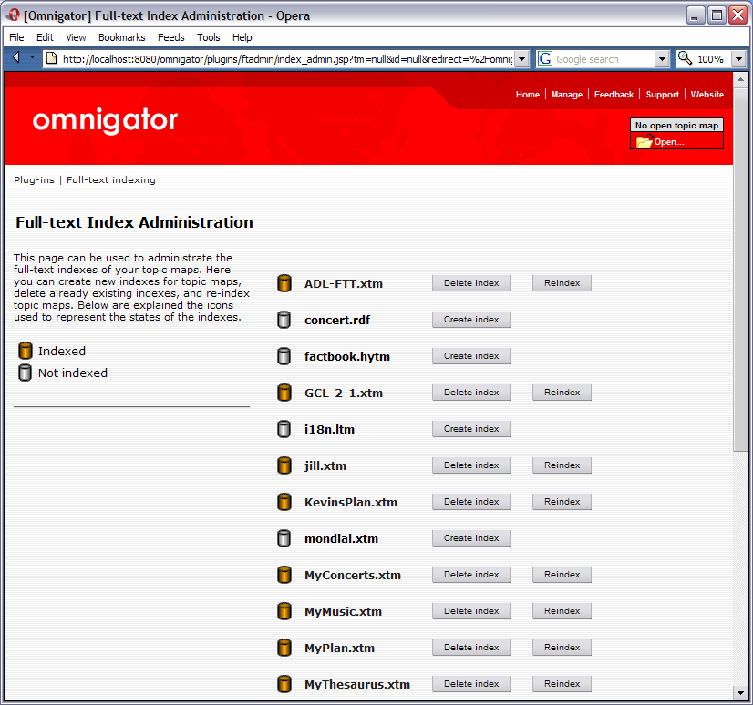 If you use an application other than Ontopia’s new ontology-driven editor, Ontopoly, to modify a topic map that is already loaded, you will need to reload it in order to see the effects of your changes. This is easily done via the Reload button in the top right-hand corner. After reloading the topic map, the Omnigator attempts to return you to the topic page you were on; if this is not possible (because the topic map no longer contains a topic with the same XML ID), you will be returned to the topic map’s Index Page. (NOTE: If the topic map is full-text indexed (see section 3.6.8), it will be automatically reindexed when you reload it. If the topic map is large this might take some time.)